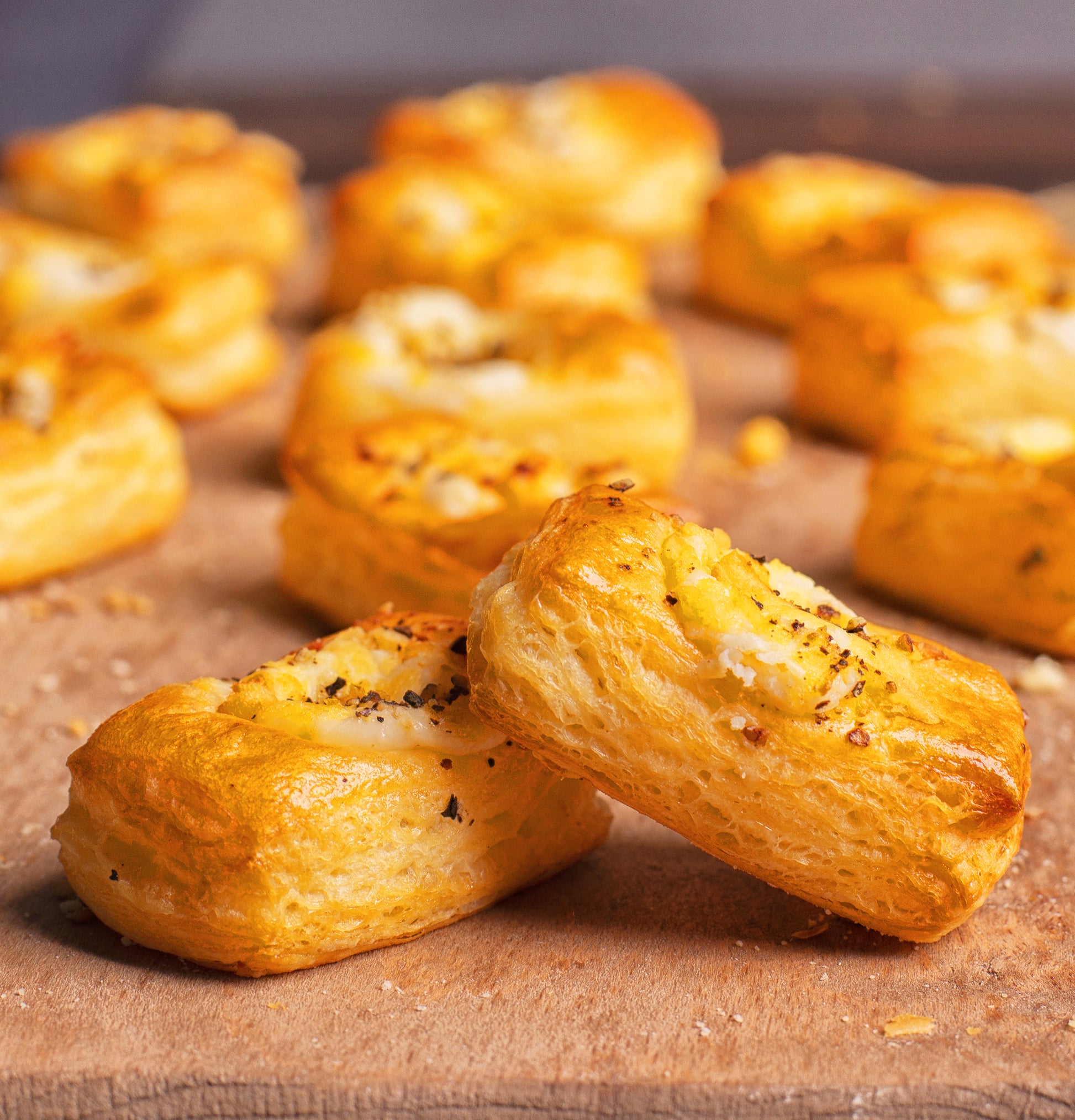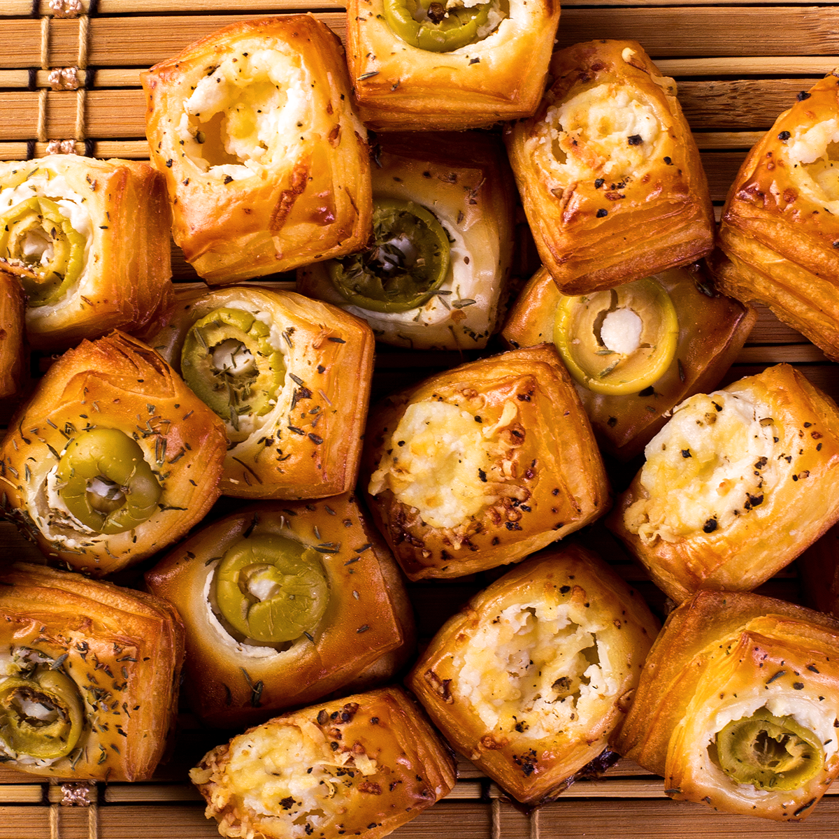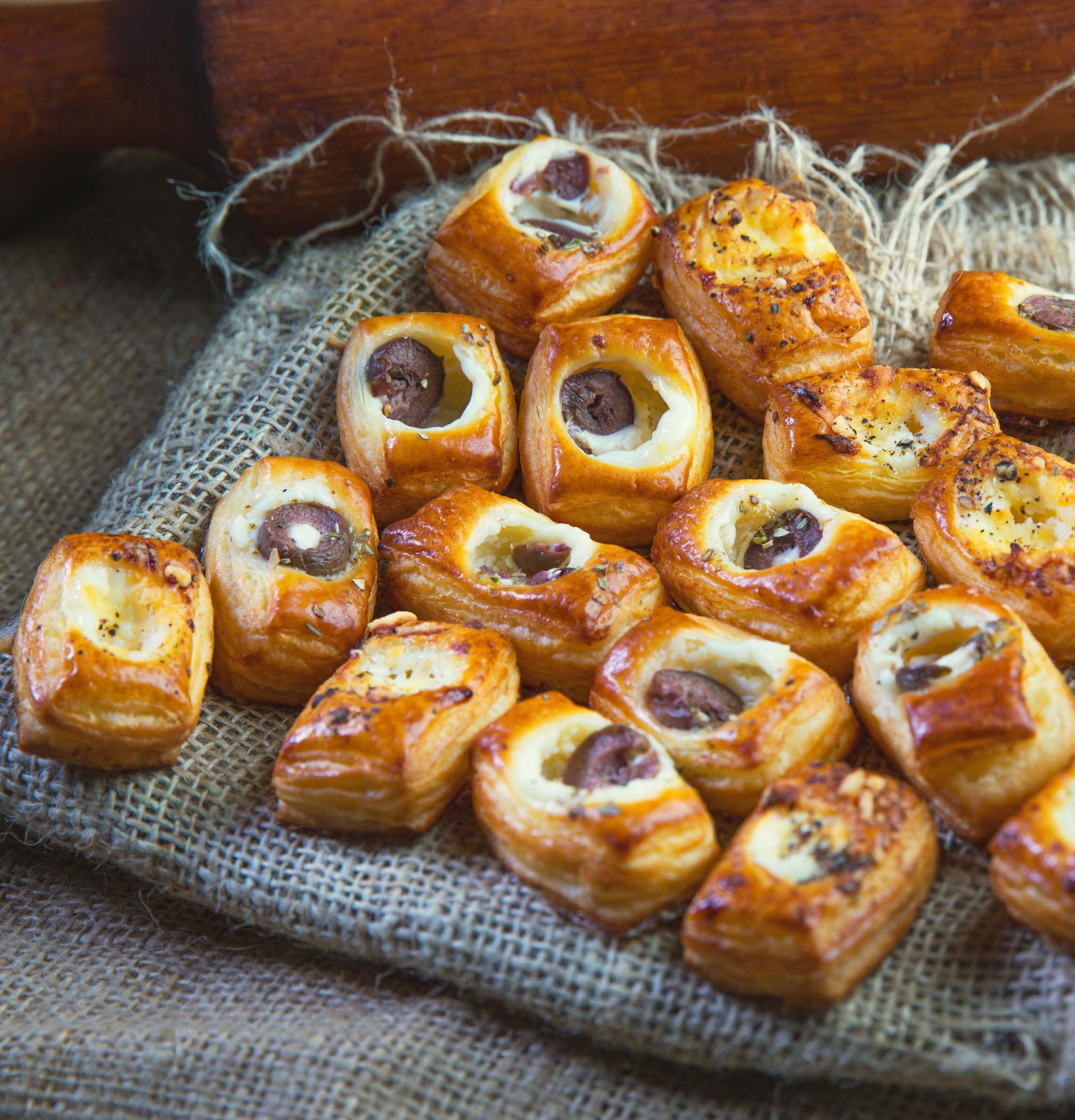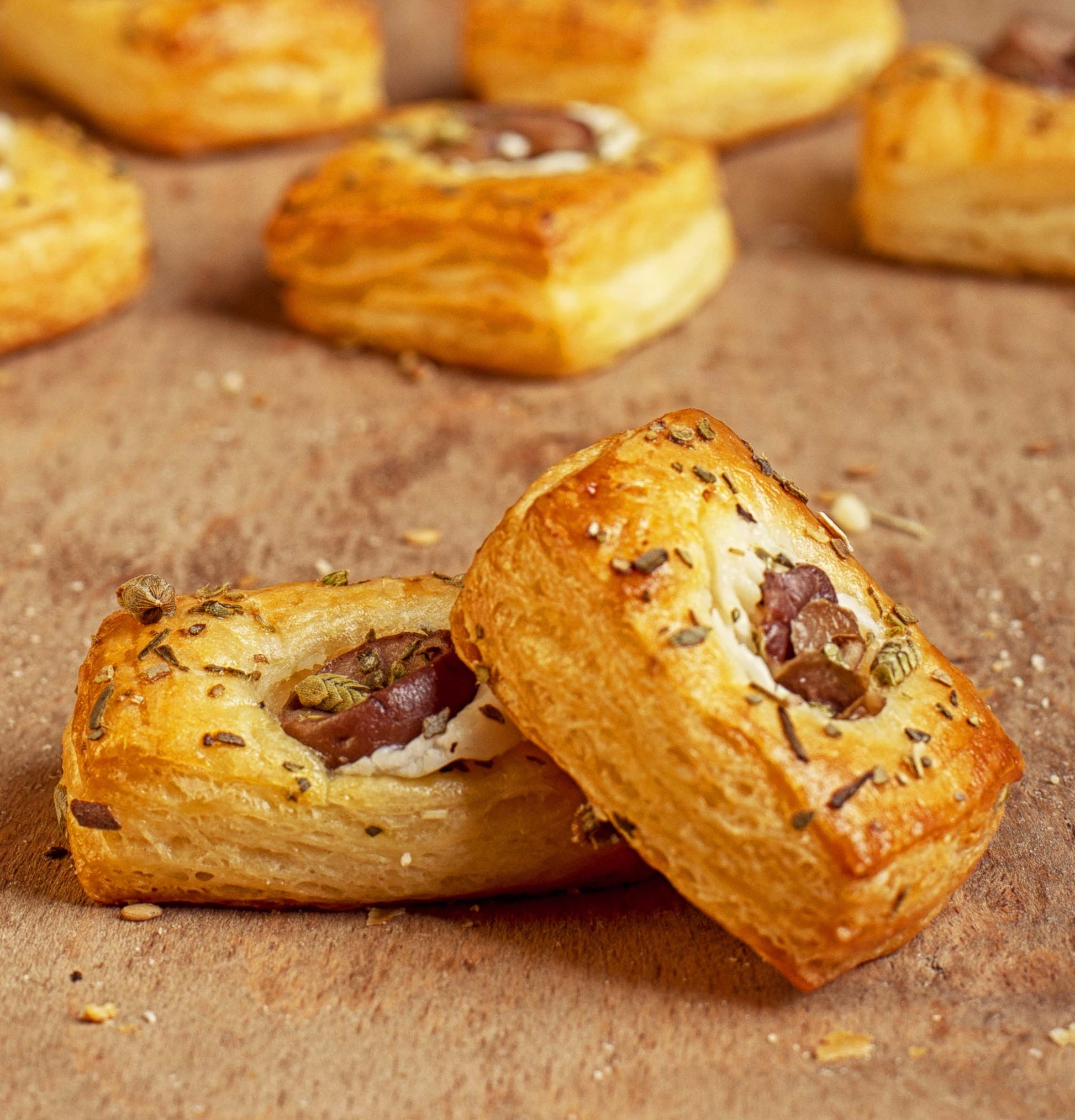 The original croissant dough cuts stuffed with mix cheese and cheese with olives and thyme